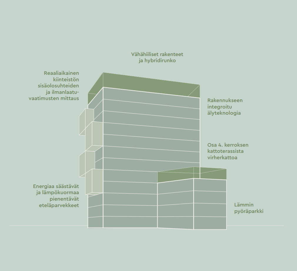 Oivaltavat elementit, kuten eteläisen julkisivun energiaa säästävät parvekkeet, viherkatot sekä vähäpäästöiset rakennusmateriaalit mahdollistavat WELL-sertifioinnin haun. Digitaalinen liitettävyys ja rakennukseen integroitu älyteknologia puolestaan mahdollistavat Smartscore -älyrakennus sertifioinnin hakemisen.
